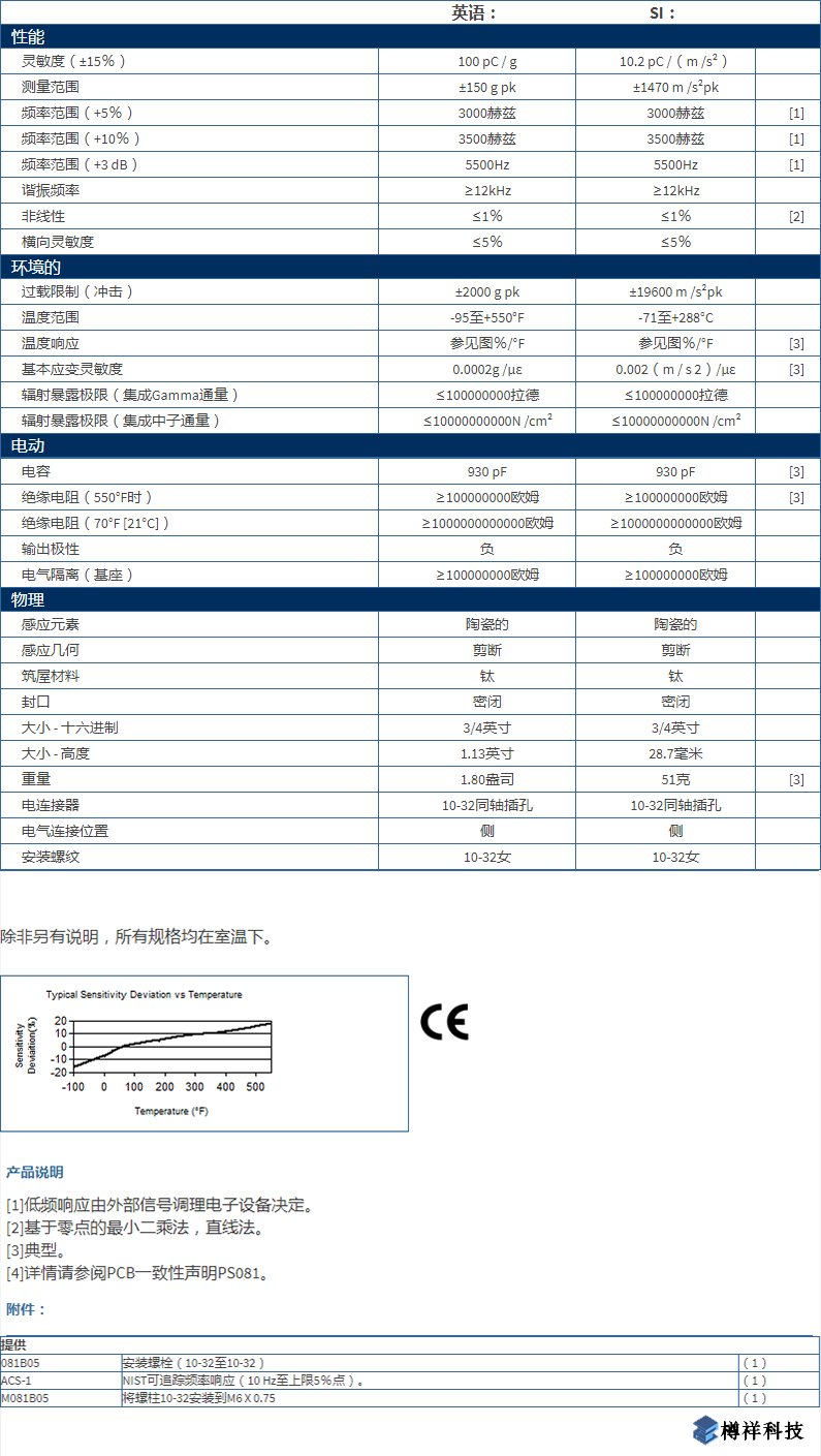 產品特點:電荷輸出加速度,100 pC / g,150g,3kHz,10-32側連接,高溫。+550 F(+288 C),Rad Hard靈敏度:(±15%)100 pC / g(10.2 pC /(m /s2))測量范圍:±150 g pk(±1470 m /s2pk)頻率范圍:(+ 5%)3000 Hz重量:1.80盎司(51克)