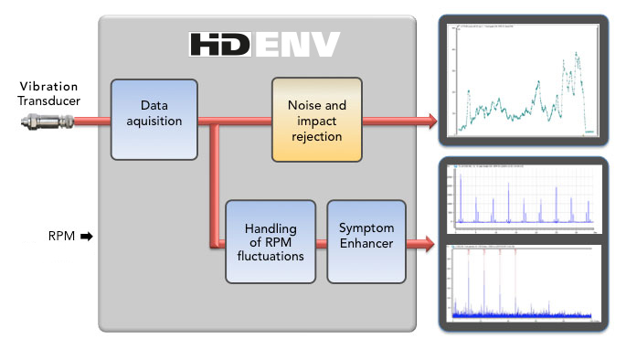 HD ENV將振動包絡提升到一個全新的水平,是傳統振動技術的理想補充。能夠在非常早的階段檢測通常很難及時發現的非包絡技術的機器問題 - 例如齒輪損壞和軸承損壞 - 該方法利用巧妙設計的數字信號處理算法來獲得趨勢的***佳數據目的。