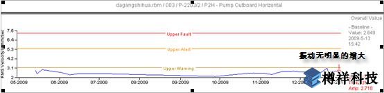 2009年12月30日監測時發現三聯合P-2203/2泵側出口端軸承波形上但突然出現沖擊信號,Peakvue值突然增大,從0.4到0.7,沖擊幅值從3突然漲到8,呈現明顯的沖擊,但振動基本無變化,如下圖所示