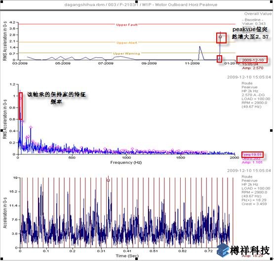 圖1:電機后軸承位置Peakvue值趨勢、頻譜及時域單峰波形