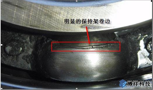 軸承拆檢后,可以看到軸承保持架已經松脫,引起軸承保持架碰磨軸承內圈,產生明顯的邊緣磨損卷邊。