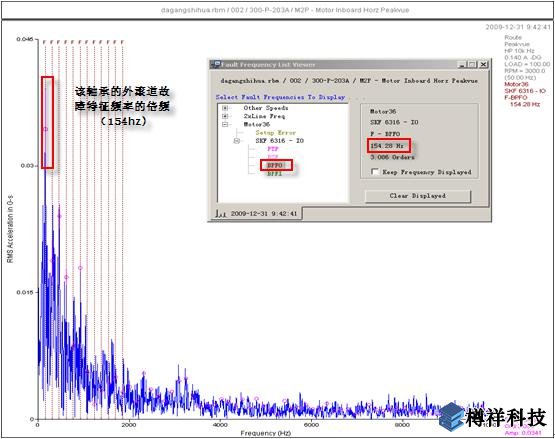 在2009年12月10號,三聯合強制循環熱水泵P-2103/1監測中發現該泵電機軸承雜音大,電機遠端軸承的Peakvue值從之前的0.2突然長到2.5,時域波形有明顯的沖擊,存在明顯的軸承保持架故障特征頻率。如下圖所示