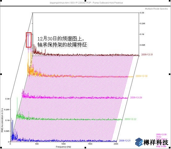 判斷為該泵電機遠端軸承保持架磨損,顯示出保持架有損壞,測試中有沖擊,現場聽到明顯雜音,建議車間停泵修理。