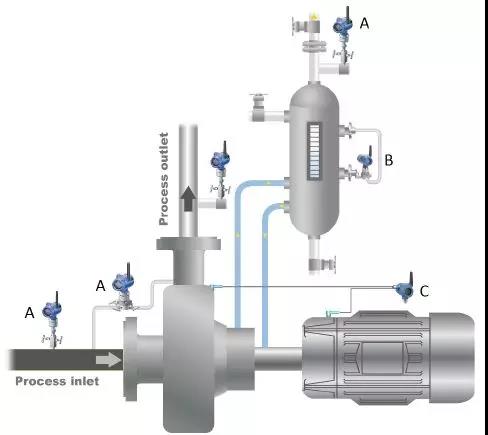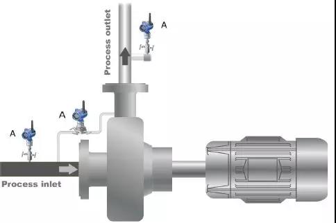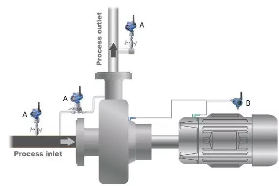 注:如圖顯示有2臺加速計測量泵和軸的振動和沖擊壓力峰值,并通過1臺振動變送器傳送