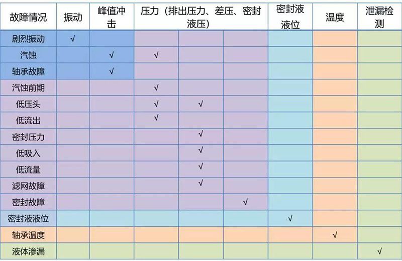 表1匯總了經常發生的泵故障及如何通過測量獲得故障預警。密封液液位和壓力、泵出口壓力和沖擊壓力峰值等信息組成了預警系統。 振動和溫度測量數據均可指示故障的發生,并可用于分析根本起因。現代化的泵健康狀態監測方案通過壓力及機械測量數據等關鍵預測維護信息全面掌握泵的情況。