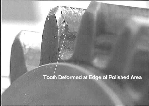 圖7.這張照片是受損牙齒邊緣的特寫鏡頭。注意接觸區域末端的鐓粗金屬。